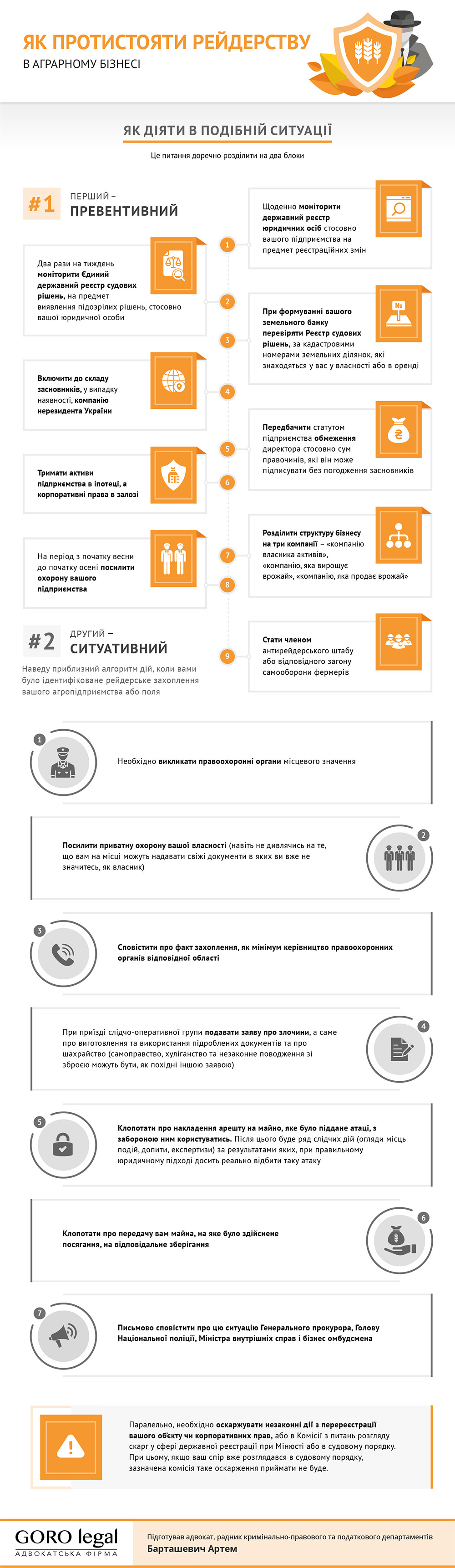 В свою очередь, юристы компании GORO Legal описывают основные методы защиты агробизнеса от рейдерства.