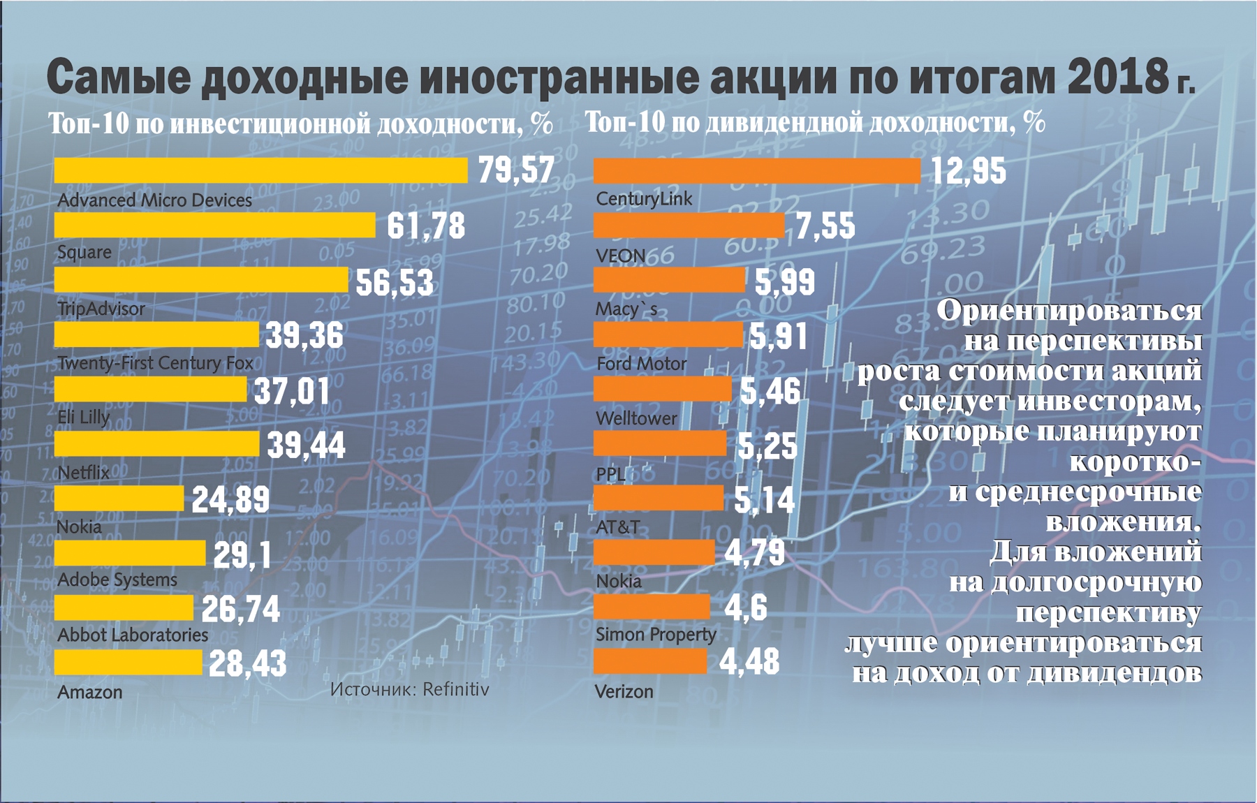 "Акции большинства крупных компаний по результатам прошлого года также показали отрицательный прирост. Тем не менее отдельные бумаги индекса S&P 500 сумели показать высокую доходность. К примеру, стоимость бумаг производителя графических процессоров и видеокарт Advanced Micro Devices (AMD) увеличилась на 70%, ценные бумаги Advance Auto Parts (AAP), производителя комплектующих запчастей для автомобилей, за 2018 г. выросли на 60%", - прокомментировал для "ВД" ситуацию аналитический департамент "Арт Капитал".