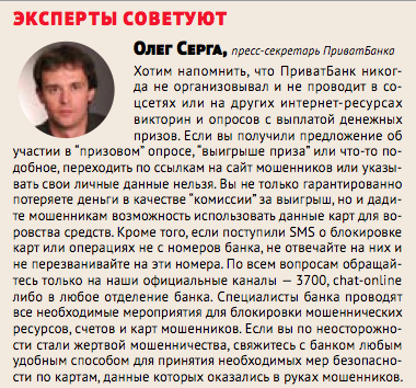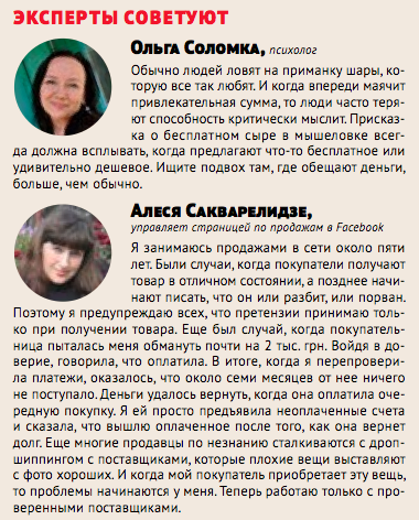 Следующий способ мошенничества — выманивание денег под предлогом оплаты за покупку в интернете. Именно так попала на деньги Елена Плахова, директор по корпоративным коммуникациям в StarLightMedia, написавшая об этом случае в Facebook: “Я искала дочери стульчик, нашла подходящий, связалась с девушкой, которая его продавала. Все вроде бы нормально. Но вот я перевела 100%-ную предоплату [за стульчик в объявлении просили 1.100 грн], а дальше девушка написала, что деньги “застряли” на карте иностранного банка и, что- бы их “протолкнуть”, мне нужно перевести еще раз точно такую же сумму”. Когда продавец продолжал настаивать на повторном платеже, Плахова сразу связалась со своим банком, его служба безопасности рекомендовала связаться с банком, в котором у продавца была открыта карта. “Оказалось, что “иностранный банк”, о котором говорила девушка, — это Сбербанк Украина. Я с ними связалась и дала всю информацию, но они, судя по нашей переписке, бессильны и могут играть только в бумагомарательство”, — возмущена Плахова.
